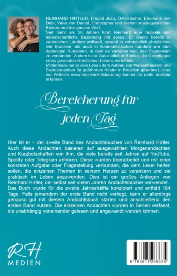 Hier ist er: der zweite Band des Andachtsbuches von Reinhard Hirtler. Auch diese Andachten basieren auf ausgewählten Morgenandachten und Kurzbotschaften von ihm, die viele bereits seit Jahren auf YouTube, Spotify oder Telegram anhören. Diese wurden überarbeitet und mit einer konkreten Aufgabe oder Fragestellung verbunden, die dem Leser helfen sollen, die einzelnen Themen in seinem Herzen zu verankern und sie praktisch im Leben anzuwenden. Dies ist ein großes Anliegen von Reinhard Hirtler, der selbst seit vielen Jahren Andachtsbücher verwendet.